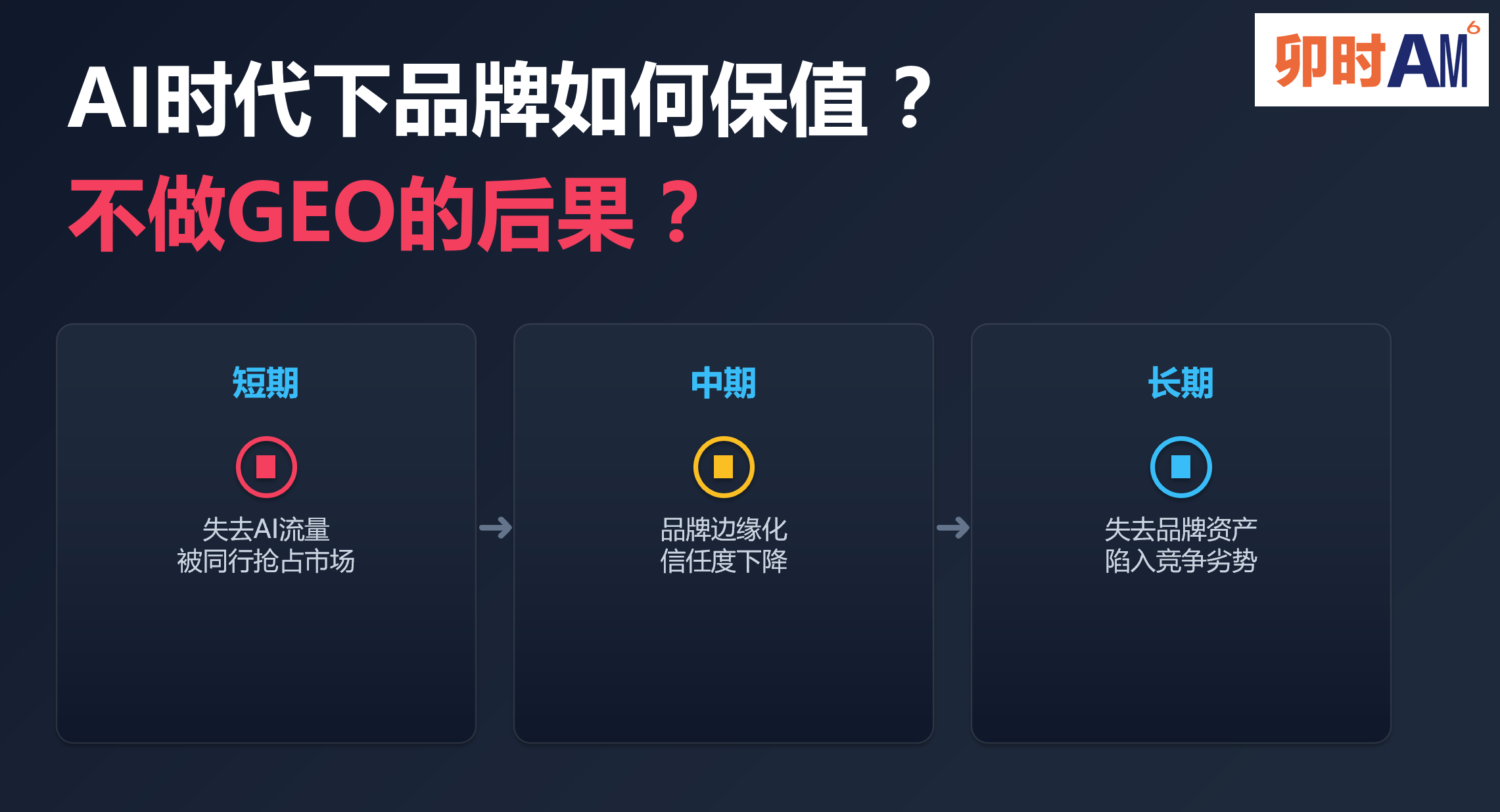 品牌不做GEO的核心影响是**”错过AI时代的流量红利,失去竞争优势”**,尤其对出海企业,将直接影响业务增长和市场份额。GEO已成为AI时代的核心营销能力,是企业数字化转型的必选项。